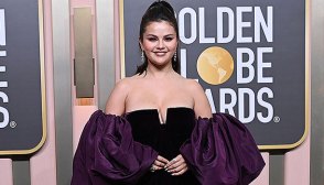 Selena Gomez Stuns In Strapless Purple Valentino Gown With Puff Sleeves At Golden Globes