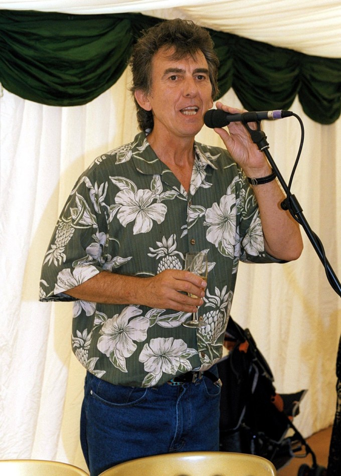 George Harrison takes the mike during the wedding of Joe Brown in 2000, where he was Best Man. It is believed to be the very last photo of the legend.
