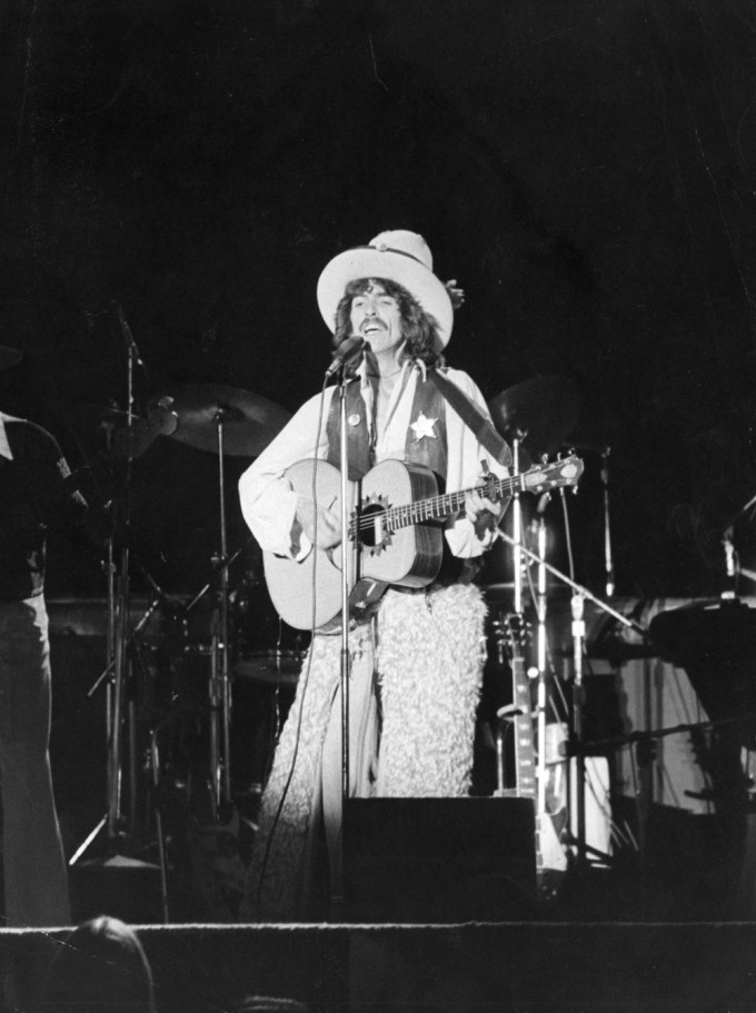 George Harrison in concert in 1974. He wore a comically big hat and fringey pants.