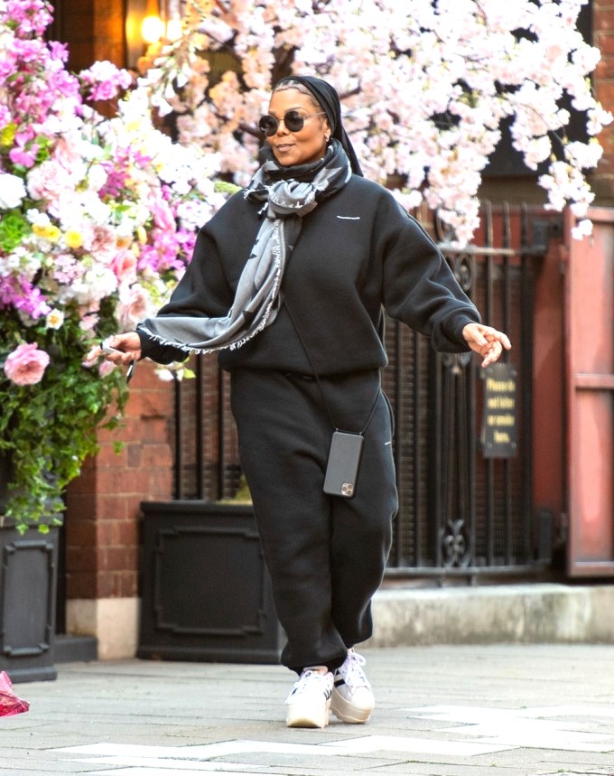 Janet Jackson is seen smiling leaving a florist in Central London on March 10, 2022. Janet, who hadn’t been seen in public in nearly one year, dressed casually in a black sweatsuit.